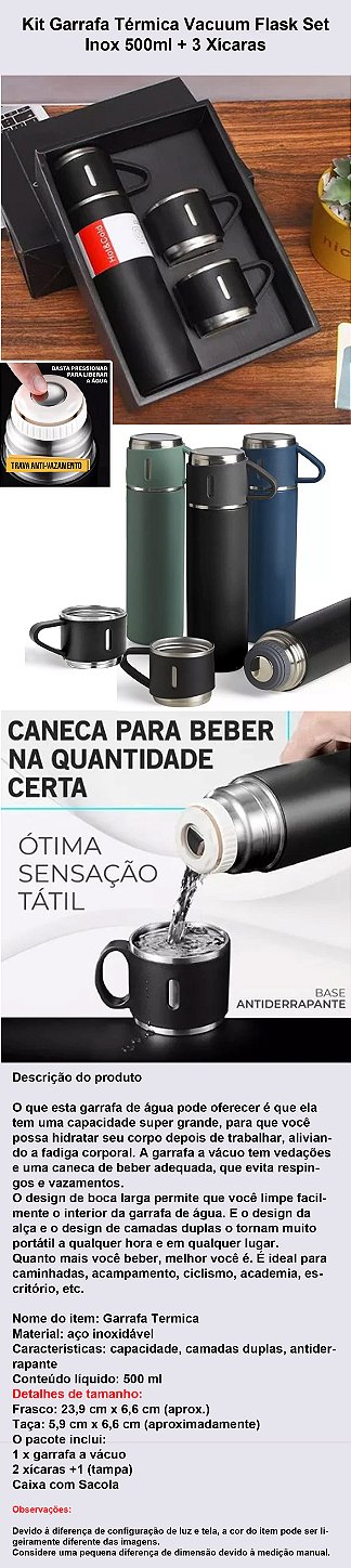 Garrafa Térmica Vacuum Flask Set Inox 500ml + Kit 3 Xícaras - Bebidas quentes ou frias sempre à mão Preto,