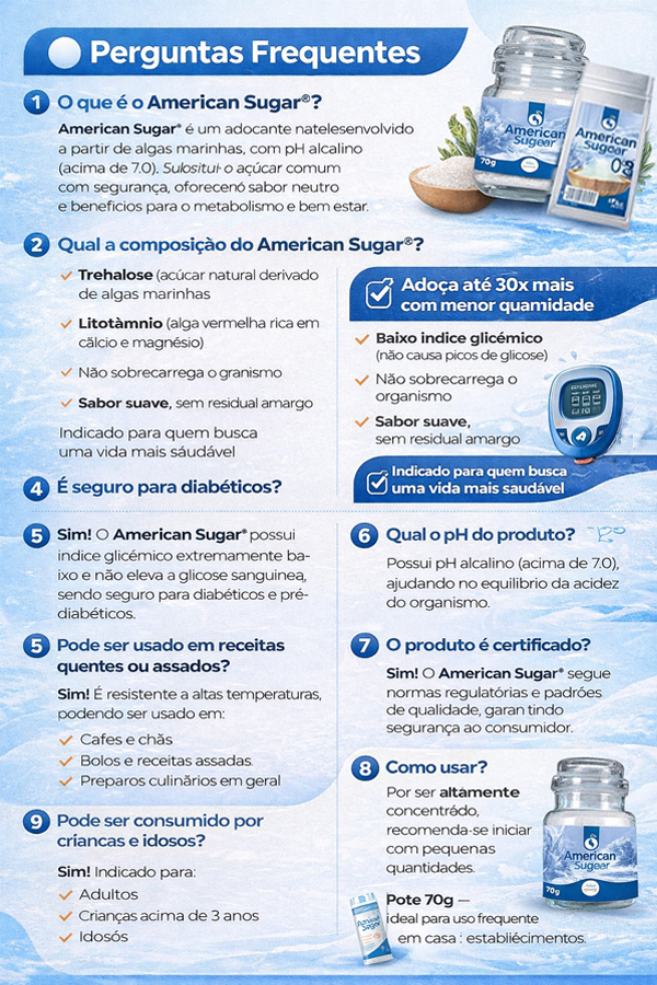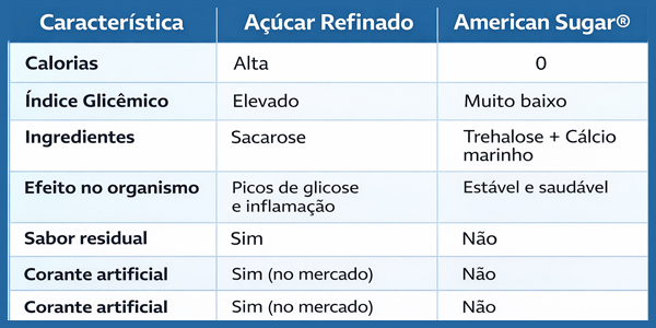 O American Sugar® é a evolução do adoçante natural. Enquanto o açúcar refinado causa picos de glicose, inflamações e acúmulo de calorias vazias, o American Sugar® oferece doçura limpa, estável e funcional. Sua fórmula exclusiva combina trealose e cálcio marinho derivado da alga Lithothamnion calcareum, promovendo equilíbrio, leveza e bem-estar.