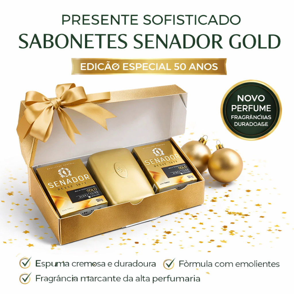 O Estojo Senador Gold com Saboneteira (390g) é uma edição especial desenvolvida em homenagem aos 50 anos da marca, trazendo elegância e exclusividade em cada detalhe.